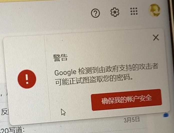我在3月7日早上9:09打开人类党网站(humanparty.me)邮箱([email protected])收到Google提示:“检测到由政府支持的攻击者可能正试图盗取您的密码。”