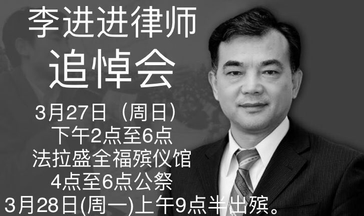 通知:3/27(今天)李进进律师网上同步追悼会链接:zoom房间号86761720770,房间密码784149。李进进律师追悼会,将于美东时间3月27日(周日)下午2点至6点在法拉盛全福殡仪馆举行,4点至6点公祭,3月28日(周一)上午9点半出殡。 由朱伟律师主持。